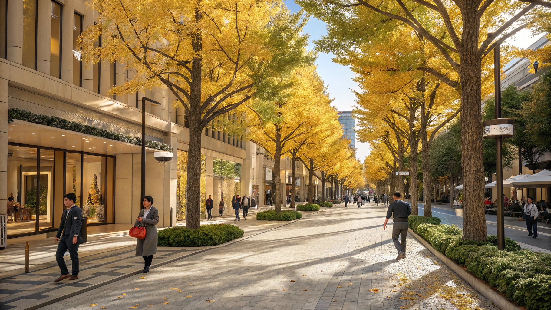 プラチナ通りの最も美しい季節は、イチョウ並木が黄金色に輝く秋です。