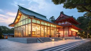 ガラス張りのスタイリッシュな拝殿は、伝統的な神社のイメージを新しくします。